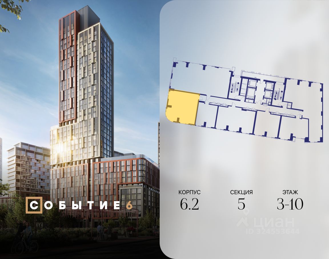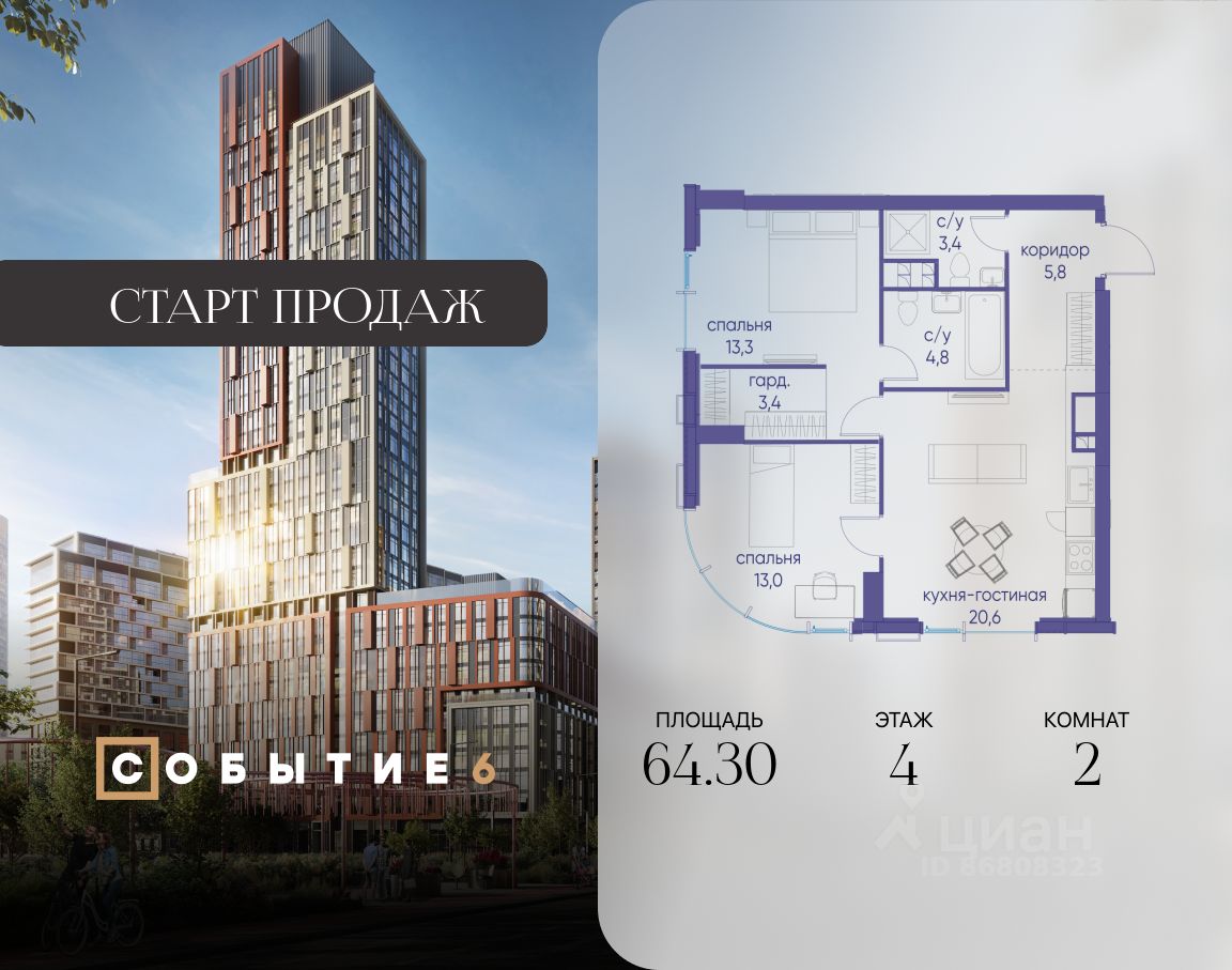 Продаётся 2-комнатная квартира от застройщика: общая площадь 64.30 м², жилая 26.30 м², кухня 20.60 м², 4-й этаж, жилой квартал "Событие-6", корпус 2 (секция 5) Срок сдачи: 1 квартал 2029 года.