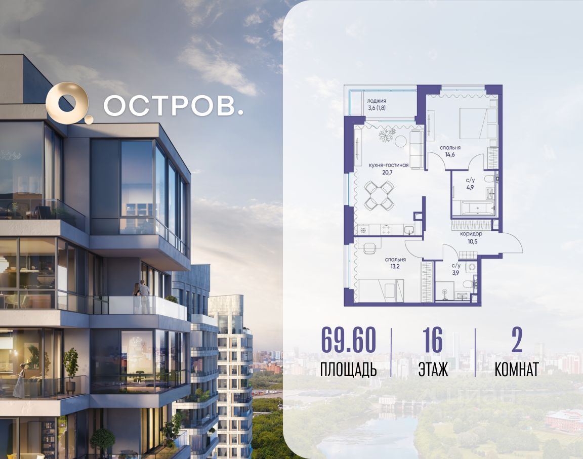 Продаётся двухкомнатная квартира от застройщика: общая площадь 69.60 м², жилая 27.80 м², кухня 20.70 м², 16, жилой квартал "Остров 6", корпус 1 (6 квартал) (секция 1). срок сдачи: 4-кв. 2025.