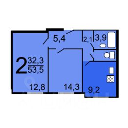 Площадь: Общая 53,8 / Жилая 32,2 / Кухня 9,2 м²