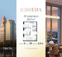 3-комн. квартира в ЖК "Era" на 35 этаже в 43 этажном здании Корпус 4. Общая площадь: 60.1 кв.м., жилая: 35.60 кв.м. Высота потолков 3.30 м.