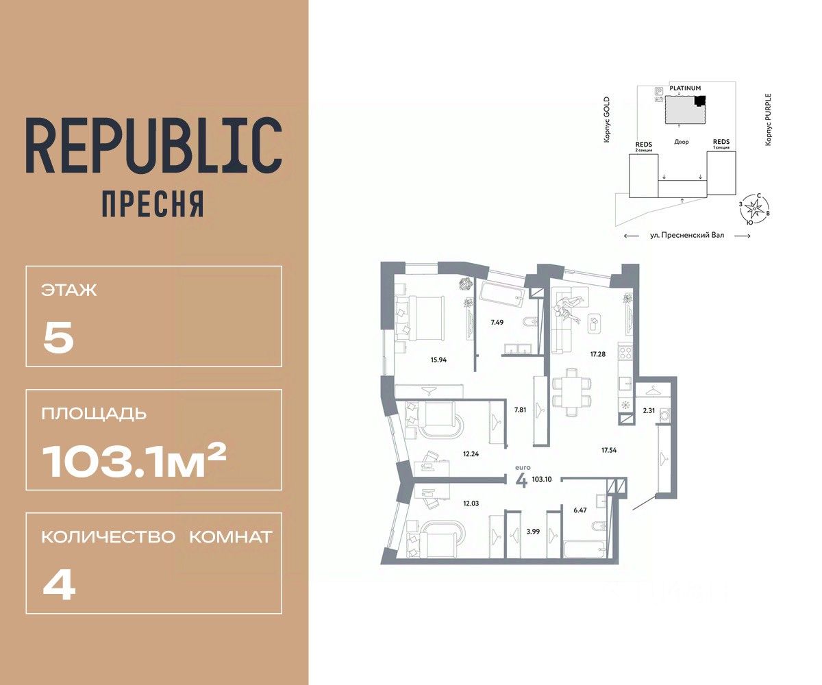 Продается 4комнатная квартира на 5 этаже от застройщика Страна Девелопмент. Площадь квартиры 103,1 кв. м. Стоимость указана без учета акций.