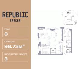 Продается 3комнатная квартира на 8 этаже от застройщика Страна Девелопмент. Площадь квартиры 96,73 кв. м. Стоимость указана без учета акций.