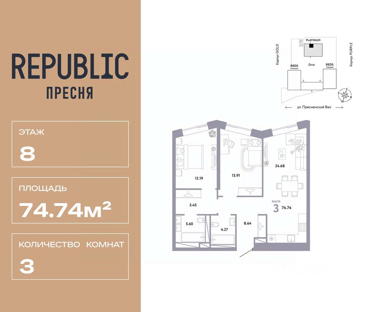 Продается 3комнатная квартира на 8 этаже от застройщика Страна Девелопмент. Площадь квартиры 74,74 кв. м. Стоимость указана без учета акций.