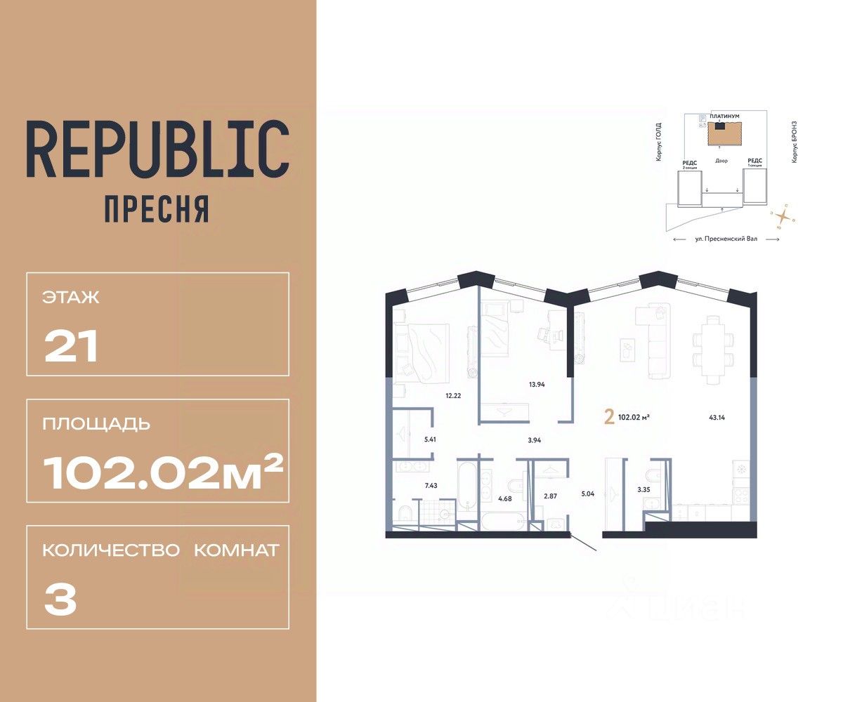 Продается 3комнатная квартира на 21 этаже от застройщика Страна Девелопмент. Площадь квартиры 102,02 кв. м.