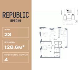 Продается 4комнатная квартира на 23 этаже от застройщика Страна Девелопмент. Площадь квартиры 128,6 кв. м. Стоимость указана без учета акций.