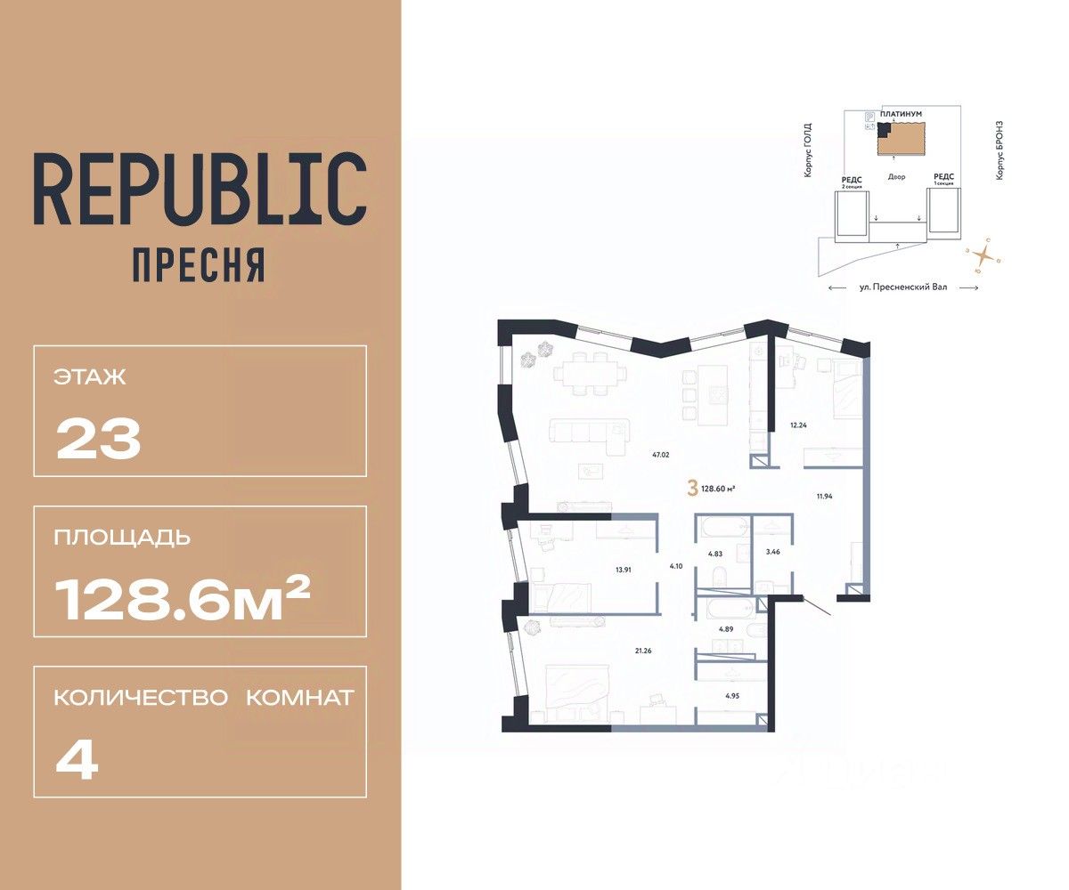 Продается 4комнатная квартира на 23 этаже от застройщика Страна Девелопмент. Площадь квартиры 128,6 кв. м.