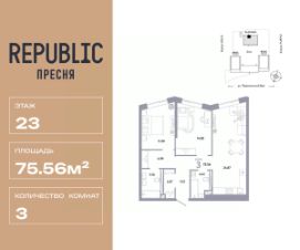 Продается 3комнатная квартира на 23 этаже от застройщика Страна Девелопмент. Площадь квартиры 75,56 кв. м.