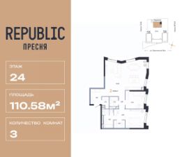 Продается 3комнатная квартира на 24 этаже от застройщика Страна Девелопмент. Площадь квартиры 110,58 кв. м.