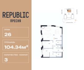 Продается 3комнатная квартира на 26 этаже от застройщика Страна Девелопмент. Площадь квартиры 104,34 кв. м.