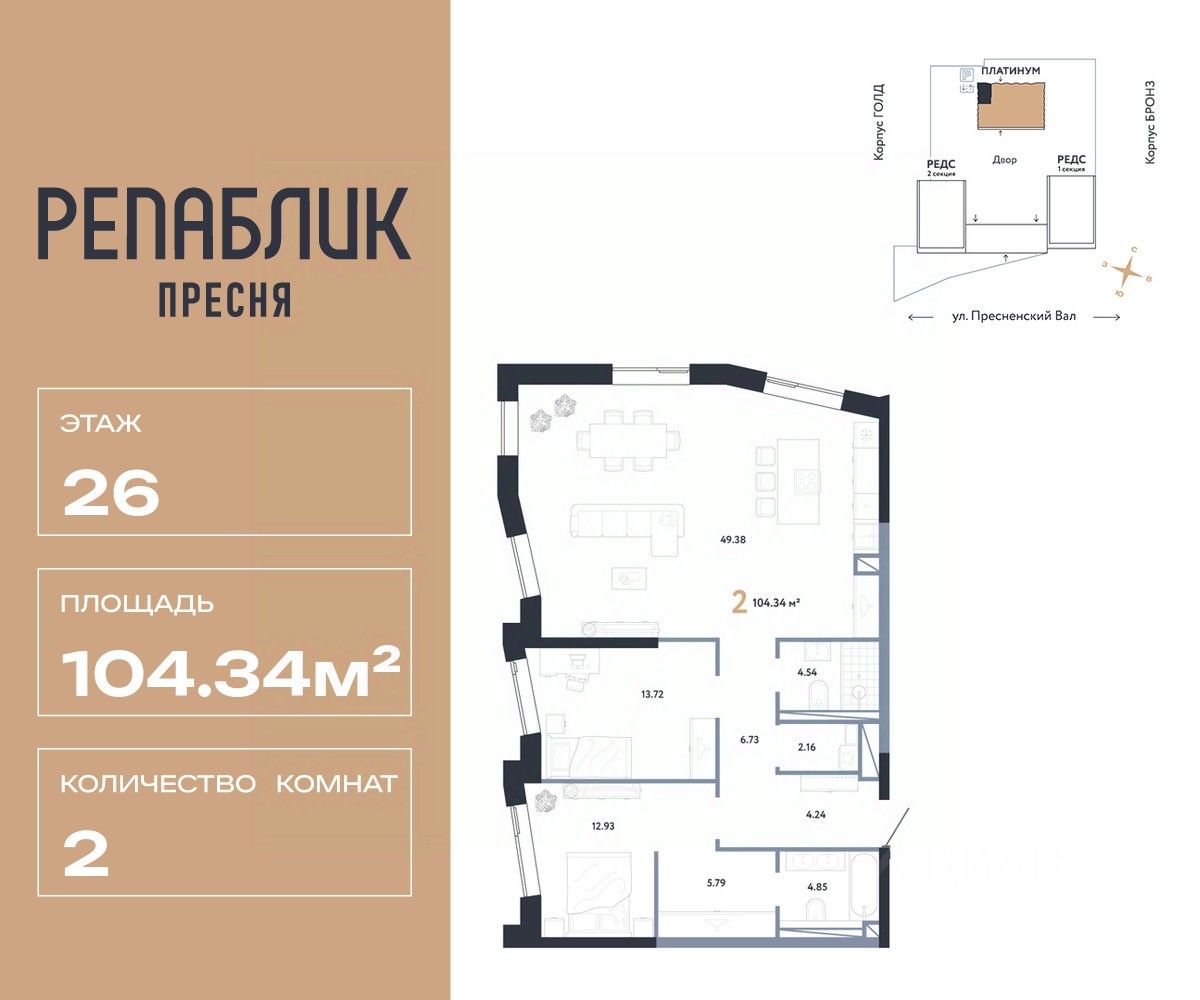 Продается 3комнатная квартира на 26 этаже от застройщика Страна Девелопмент. Площадь квартиры 104.34 кв. м.