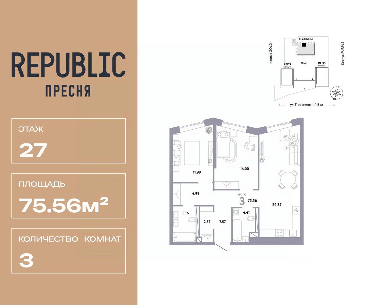Продается 3комнатная квартира на 27 этаже от застройщика Страна Девелопмент. Площадь квартиры 75,56 кв. м. Стоимость указана без учета акций.