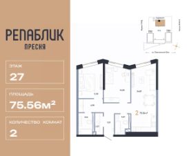 Продается 3комнатная квартира на 27 этаже от застройщика Страна Девелопмент. Площадь квартиры 75.56 кв. м.