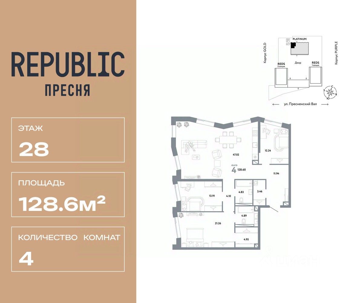 Продается 4комнатная квартира на 28 этаже от застройщика Страна Девелопмент. Площадь квартиры 128,6 кв. м. Стоимость указана без учета акций.