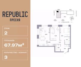 Продается 3комнатная квартира на 2 этаже от застройщика Страна Девелопмент. Площадь квартиры 67,97 кв. м.