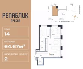 Продается 3комнатная квартира на 14 этаже от застройщика Страна Девелопмент. Площадь квартиры 64.67 кв. м.