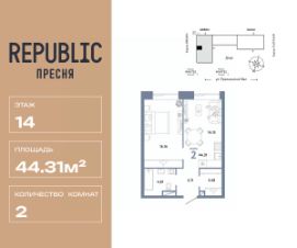 Продается 2комнатная квартира на 14 этаже от застройщика Страна Девелопмент. Площадь квартиры 44,31 кв. м.