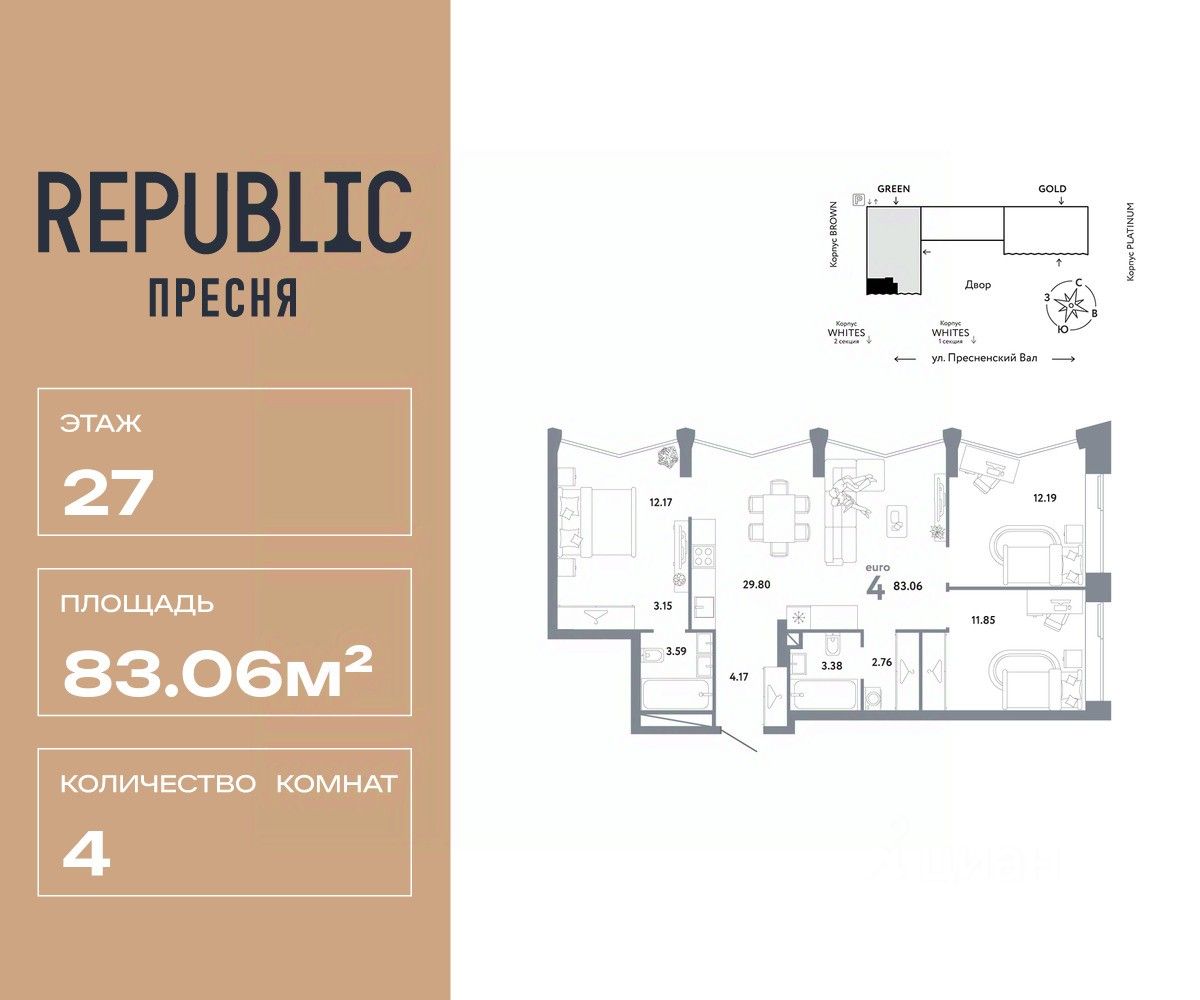 Продается 4комнатная квартира на 27 этаже от застройщика Страна Девелопмент. Площадь квартиры 83,06 кв. м. Стоимость указана без учета акций.