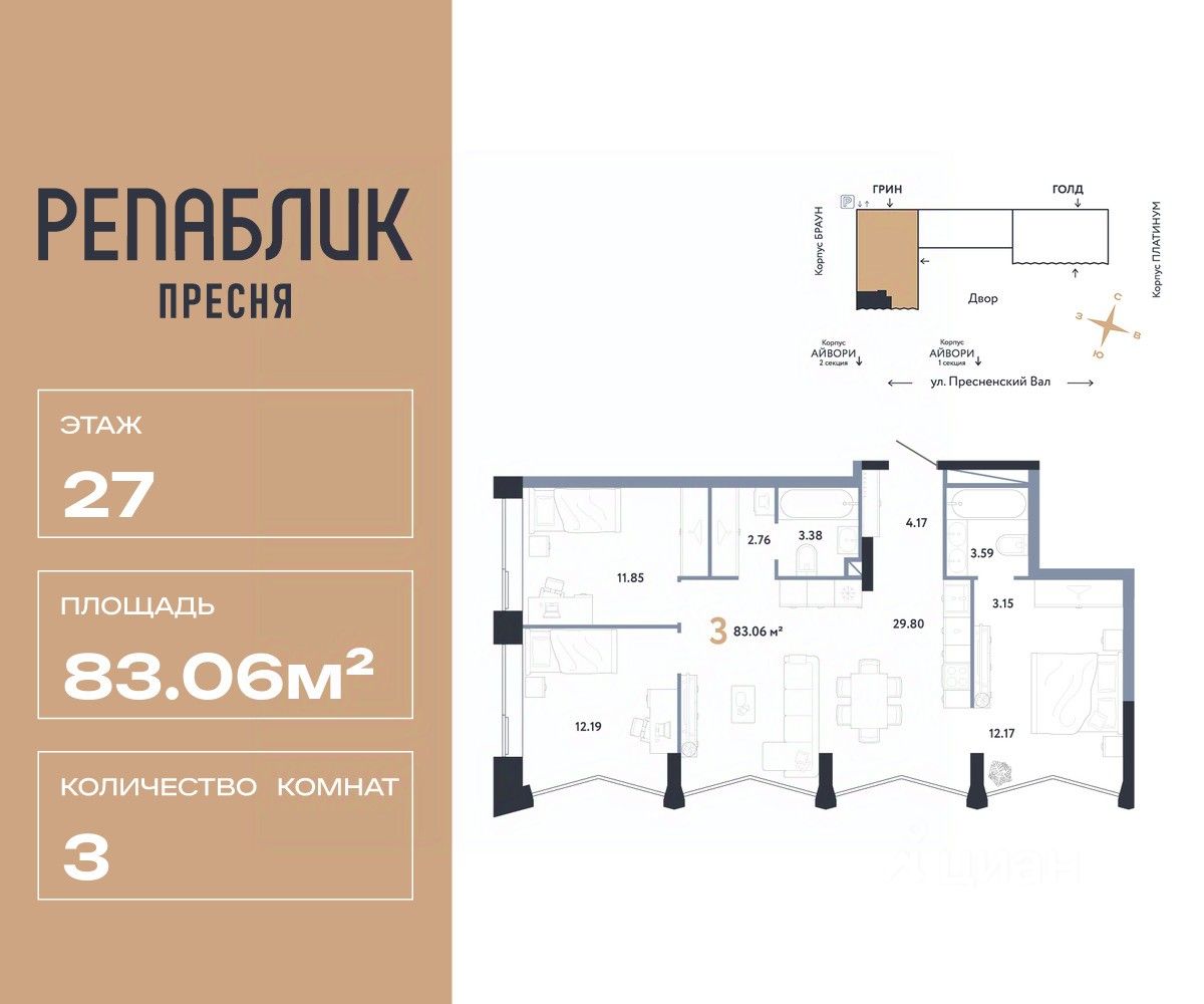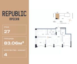 Продается 4комнатная квартира на 27 этаже от застройщика Страна Девелопмент. Площадь квартиры 83.06 кв. м.