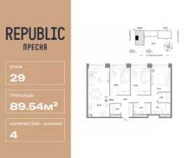 Продается 4комнатная квартира на 29 этаже от застройщика Страна Девелопмент. Площадь квартиры 89,54 кв. м.
