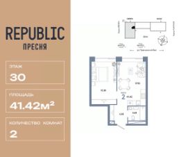 Продается 2комнатная квартира на 30 этаже от застройщика Страна Девелопмент. Площадь квартиры 41,42 кв. м.