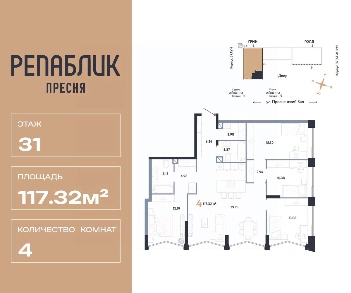 Продается 5комнатная квартира на 31 этаже от застройщика Страна Девелопмент. Площадь квартиры 117.32 кв. м.