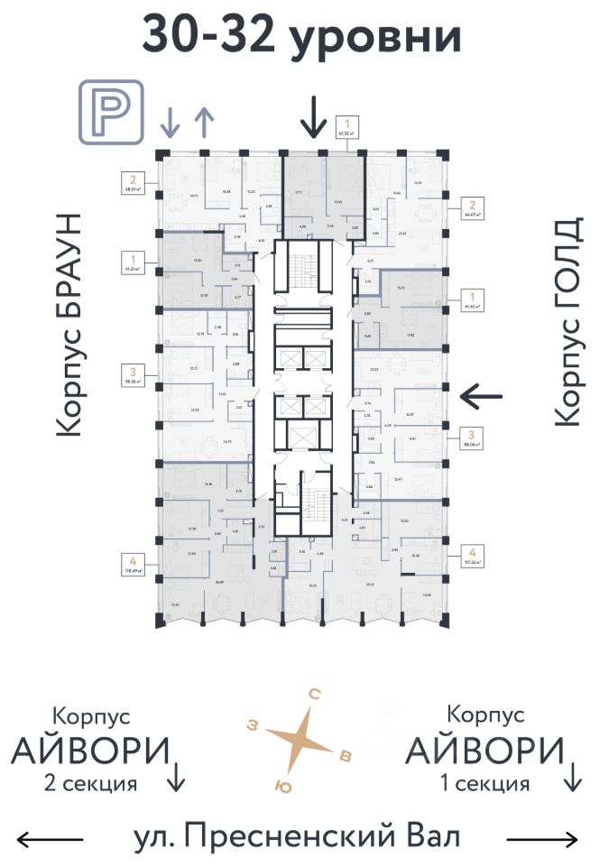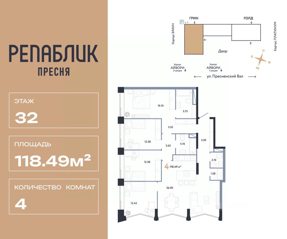 Продается 5комнатная квартира на 32 этаже от застройщика Страна Девелопмент. Площадь квартиры 118.49 кв. м.