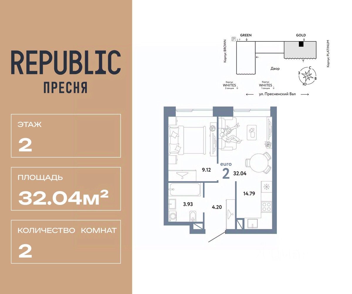 Продается 2комнатная квартира на 2 этаже от застройщика Страна Девелопмент. Площадь квартиры 32,04 кв. м.