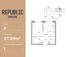 Продается 1комнатная квартира на 2 этаже от застройщика Страна Девелопмент. Площадь квартиры 37,99 кв. м. Стоимость указана без учета акций.