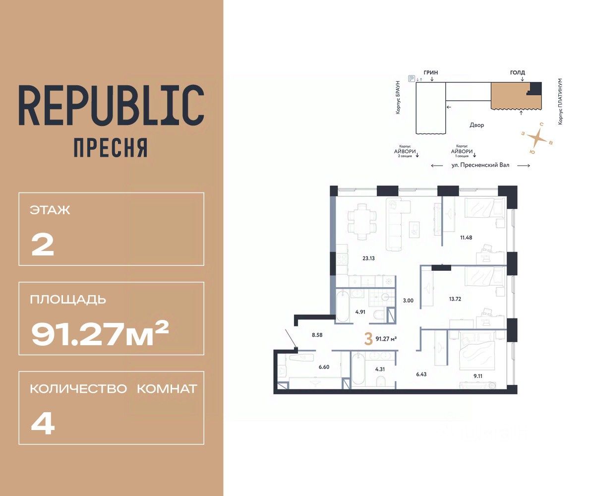 Продается 4комнатная квартира на 2 этаже от застройщика Страна Девелопмент. Площадь квартиры 91,27 кв. м.