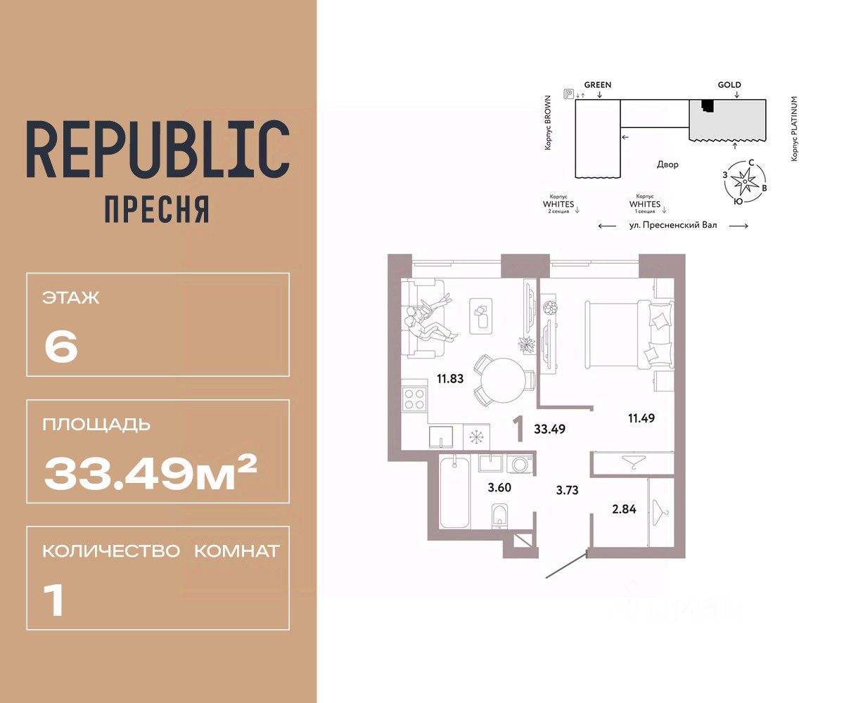 Продается 1комнатная квартира на 6 этаже от застройщика Страна Девелопмент. Площадь квартиры 33,49 кв. м. Стоимость указана без учета акций.