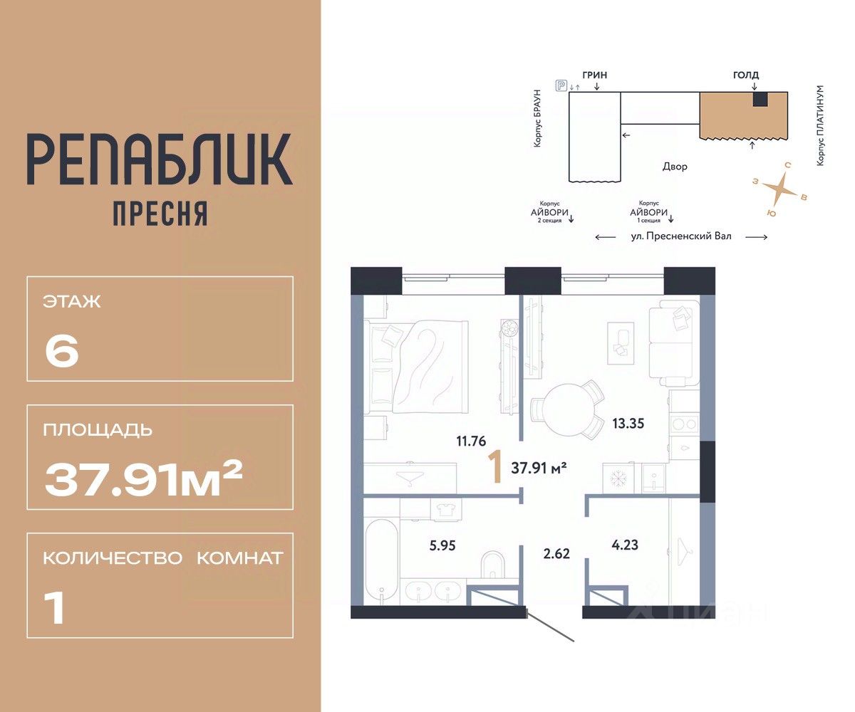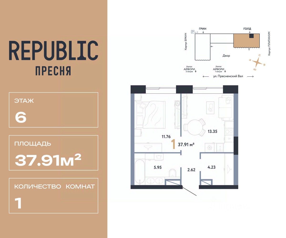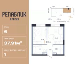 Продается 1комнатная квартира на 6 этаже от застройщика Страна Девелопмент. Площадь квартиры 37.91 кв. м.