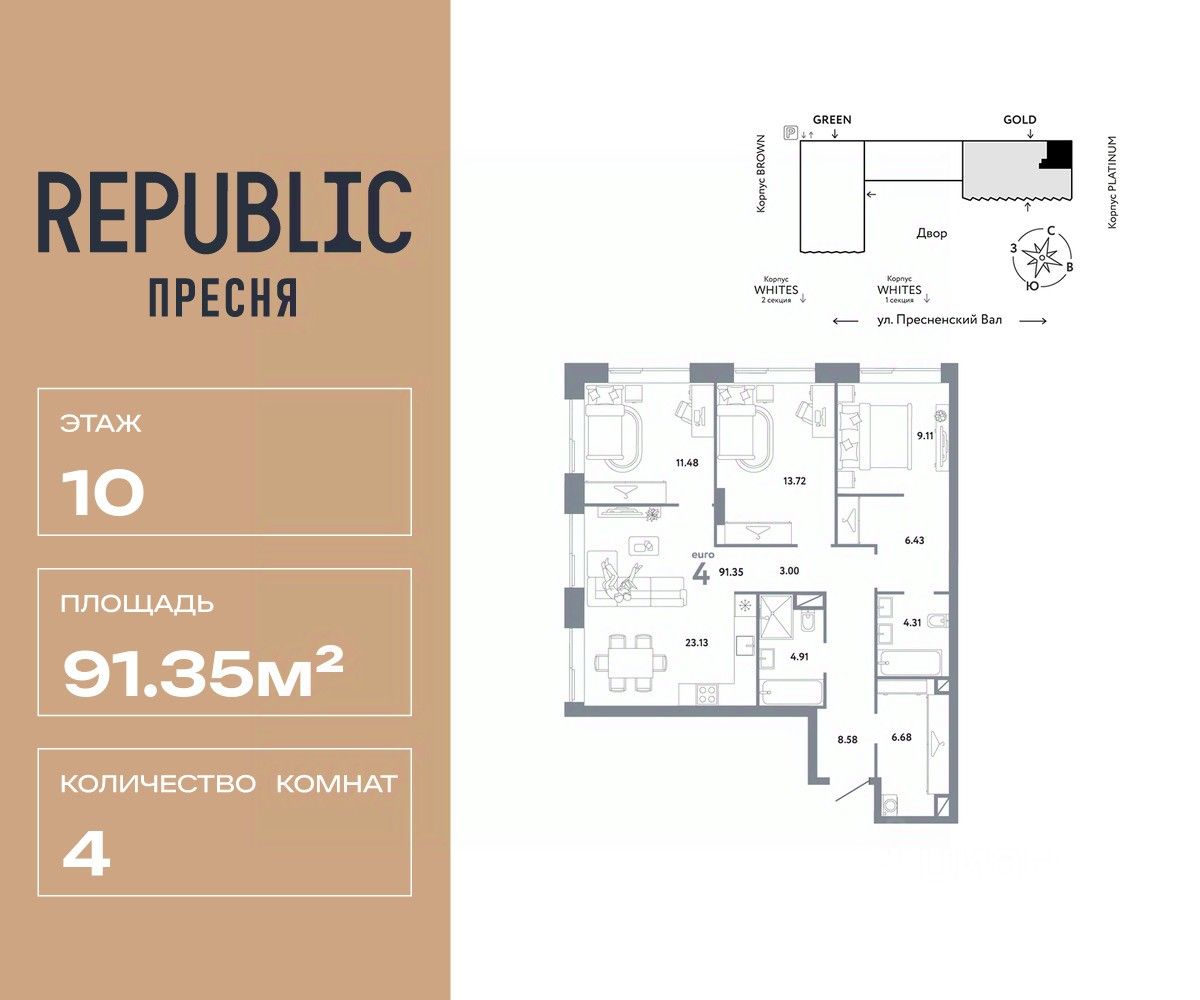 Продается 4комнатная квартира на 10 этаже от застройщика Страна Девелопмент. Площадь квартиры 91,35 кв. м. Стоимость указана без учета акций.