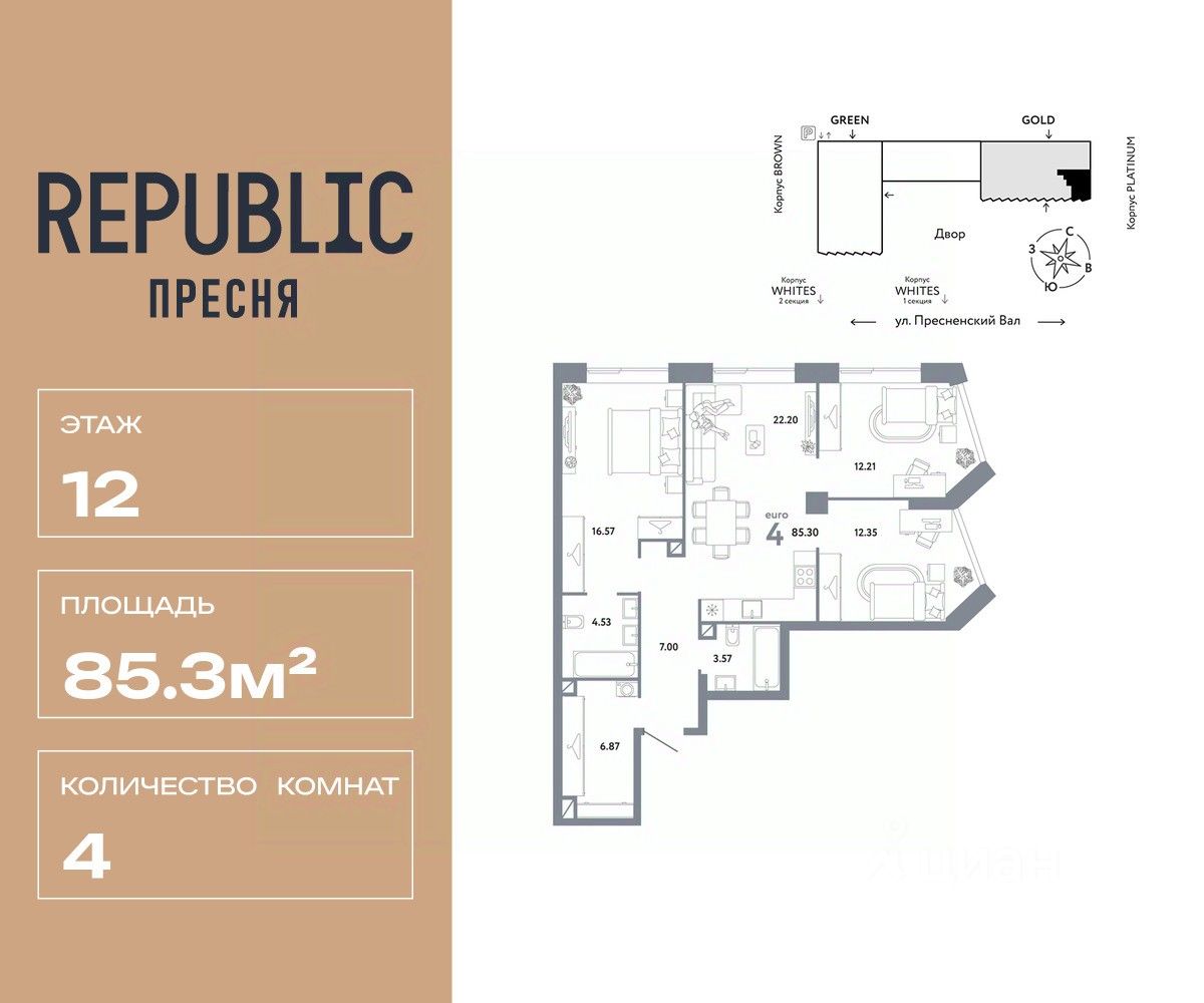 Продается 4комнатная квартира на 12 этаже от застройщика Страна Девелопмент. Площадь квартиры 85,3 кв. м.