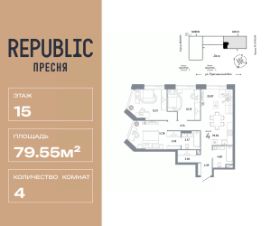 Продается 4комнатная квартира на 15 этаже от застройщика Страна Девелопмент. Площадь квартиры 79,55 кв. м.