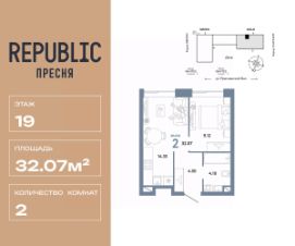 Продается 2комнатная квартира на 19 этаже от застройщика Страна Девелопмент. Площадь квартиры 32,07 кв. м.