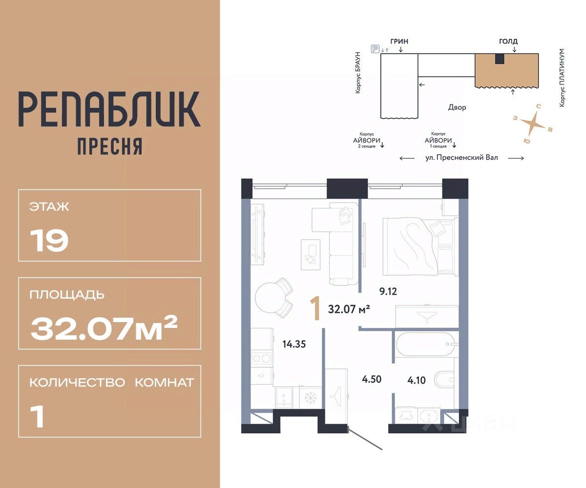 Продается 2комнатная квартира на 19 этаже от застройщика Страна Девелопмент. Площадь квартиры 32.07 кв. м.