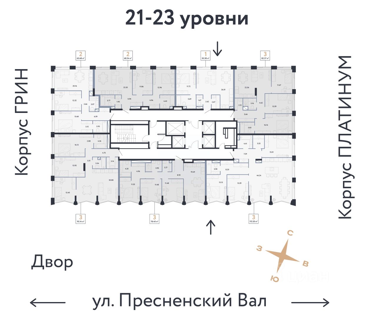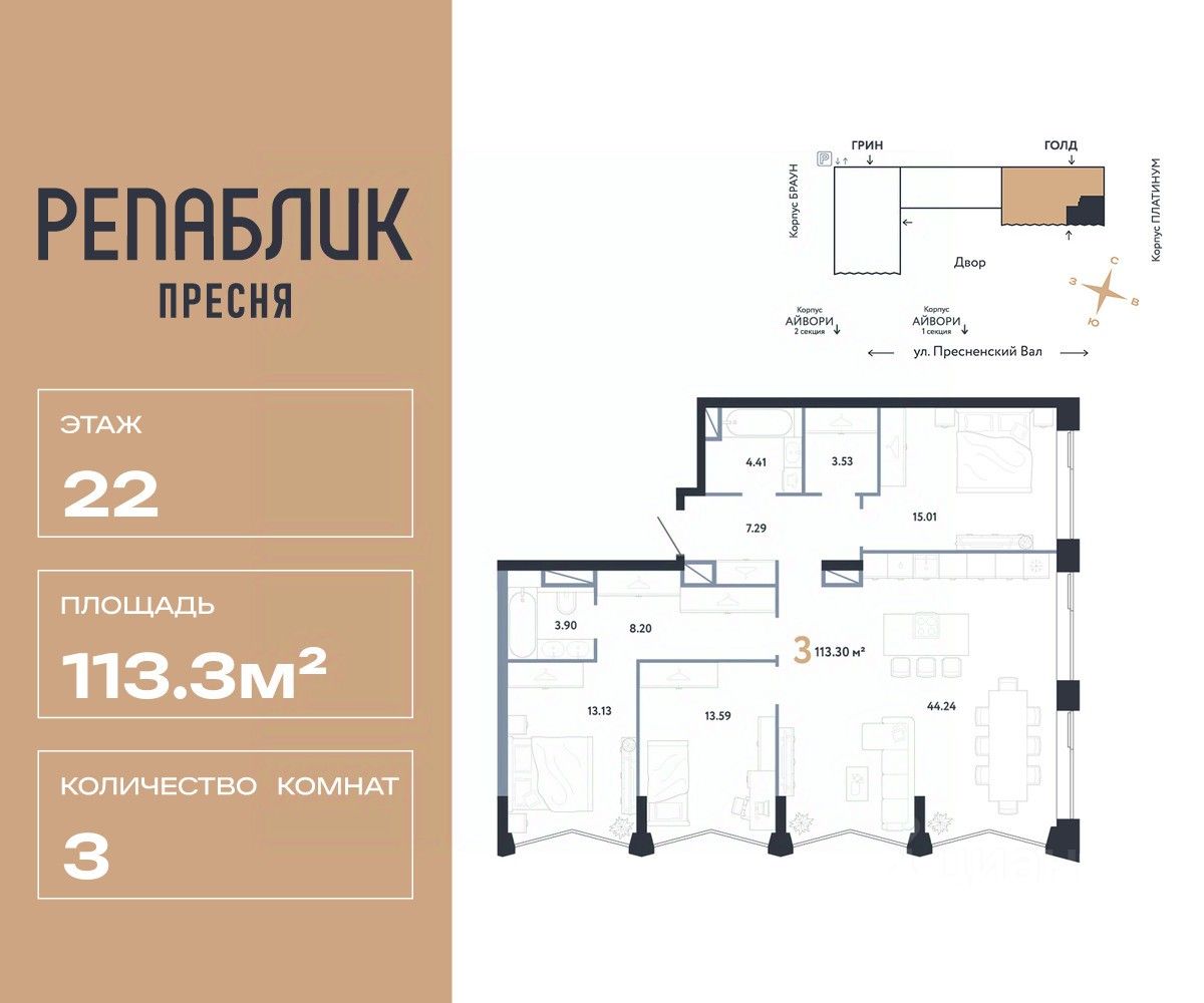Продается 4комнатная квартира на 22 этаже от застройщика Страна Девелопмент. Площадь квартиры 113.3 кв. м.
