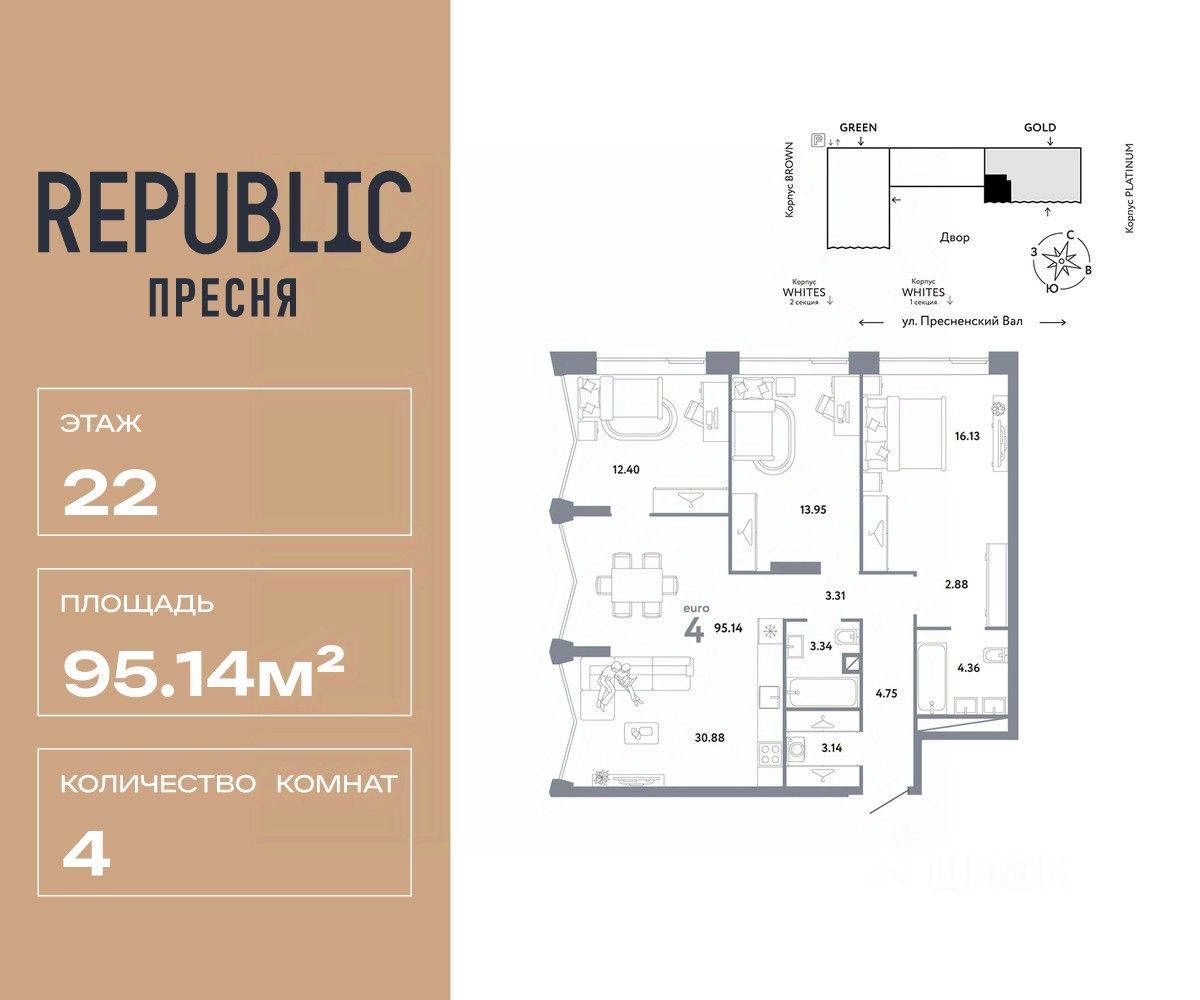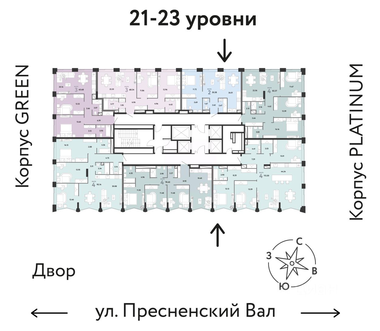 Продается 4комнатная квартира на 22 этаже от застройщика Страна Девелопмент. Площадь квартиры 95,14 кв. м. Стоимость указана без учета акций.