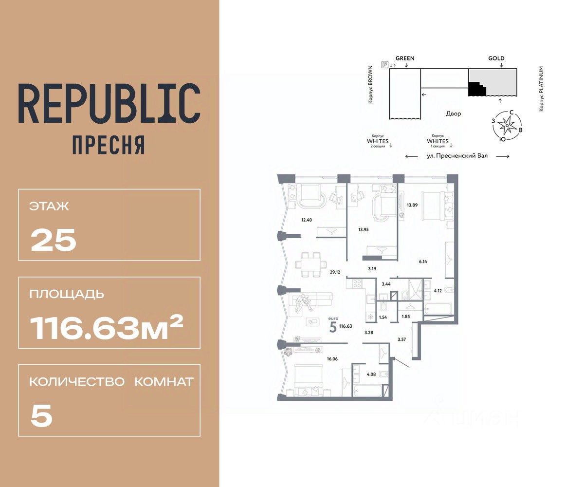 Продается 5комнатная квартира на 25 этаже от застройщика Страна Девелопмент. Площадь квартиры 116,63 кв. м.