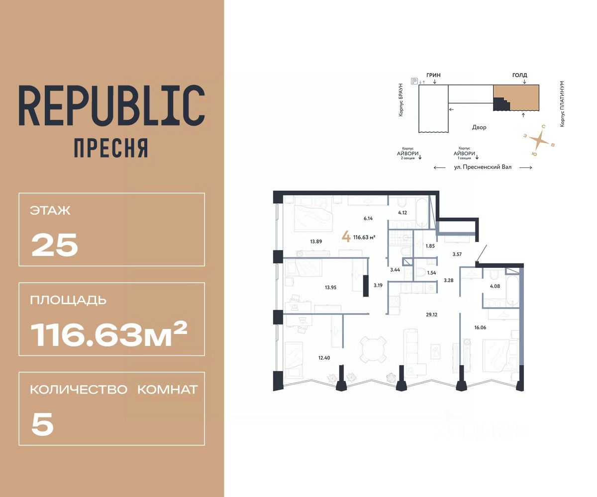 Продается 5комнатная квартира на 25 этаже от застройщика Страна Девелопмент. Площадь квартиры 116.63 кв. м.