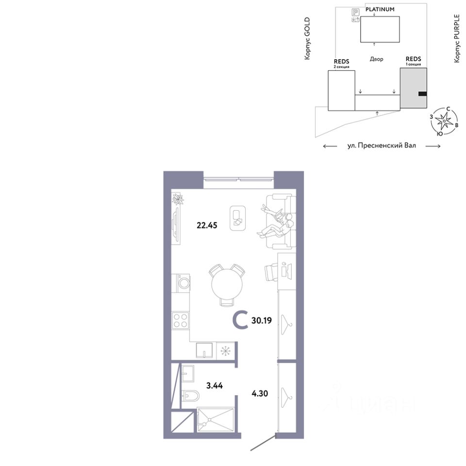 Продается 1комнатная квартира на 3 этаже от застройщика Страна Девелопмент. Площадь квартиры 30,19 кв. м. Стоимость указана без учета акций.