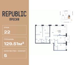 Продается 5комнатная квартира на 22 этаже от застройщика Страна Девелопмент. Площадь квартиры 129,51 кв. м.