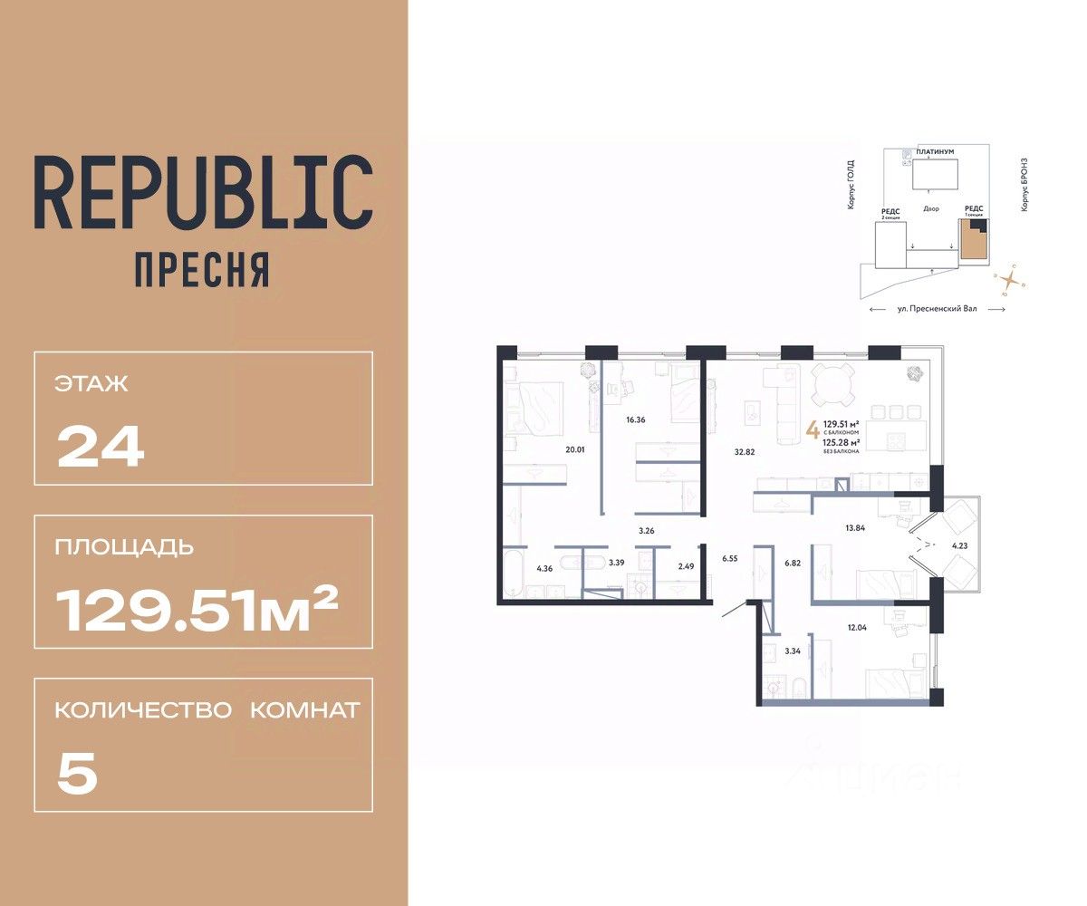 Продается 5комнатная квартира на 24 этаже от застройщика Страна Девелопмент. Площадь квартиры 129.51 кв. м.