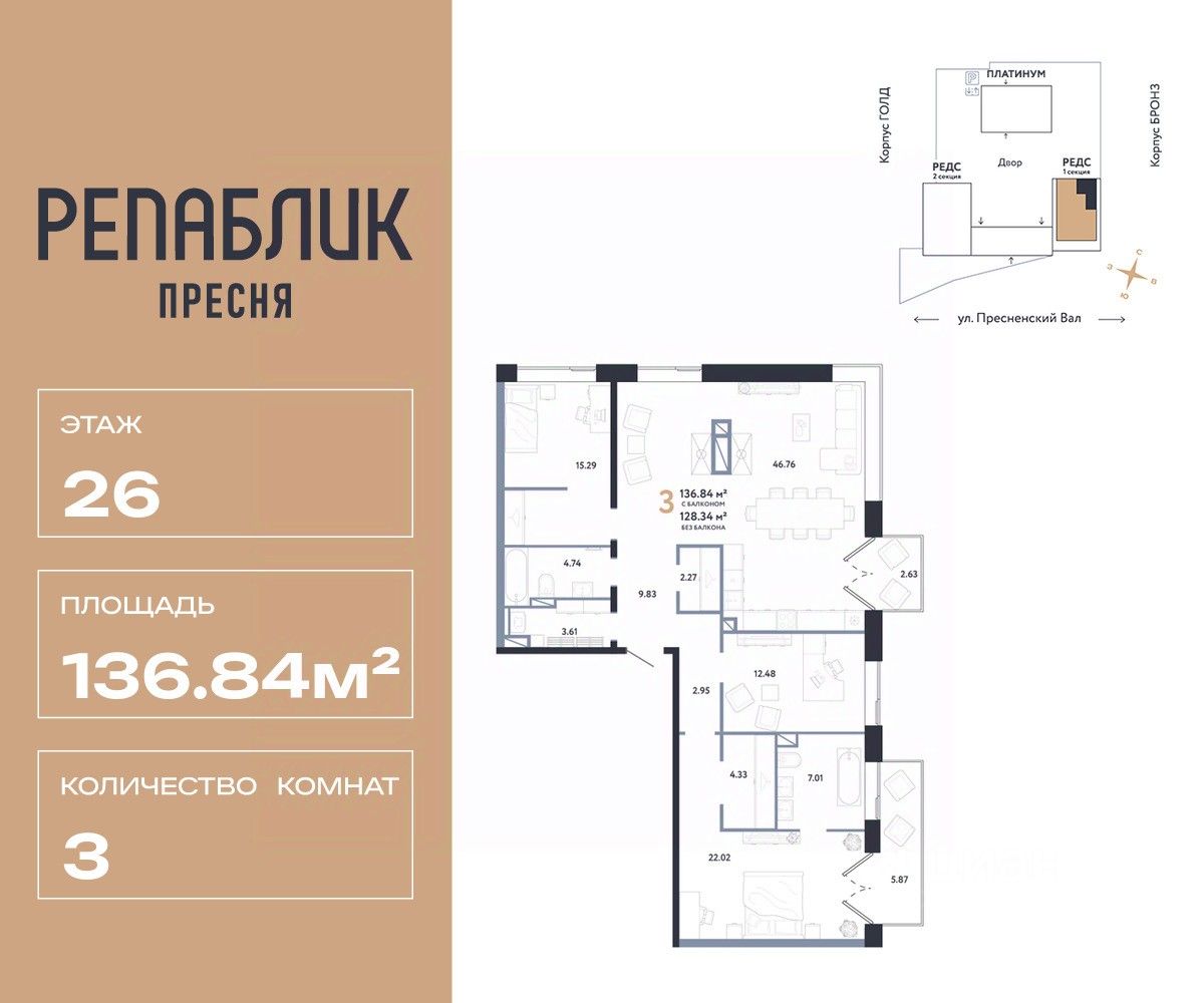 Продается 4комнатная квартира на 26 этаже от застройщика Страна Девелопмент. Площадь квартиры 136.84 кв. м.