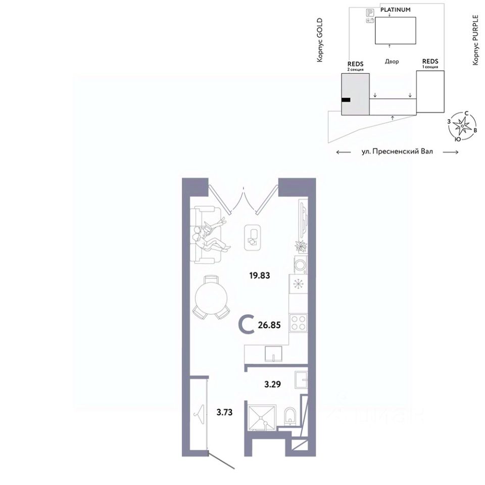 Продается 1комнатная квартира на 4 этаже от застройщика Страна Девелопмент. Площадь квартиры 26,86 кв. м. Стоимость указана без учета акций.