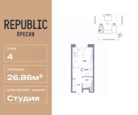 Продается 1комнатная квартира на 4 этаже от застройщика Страна Девелопмент. Площадь квартиры 26,86 кв. м.