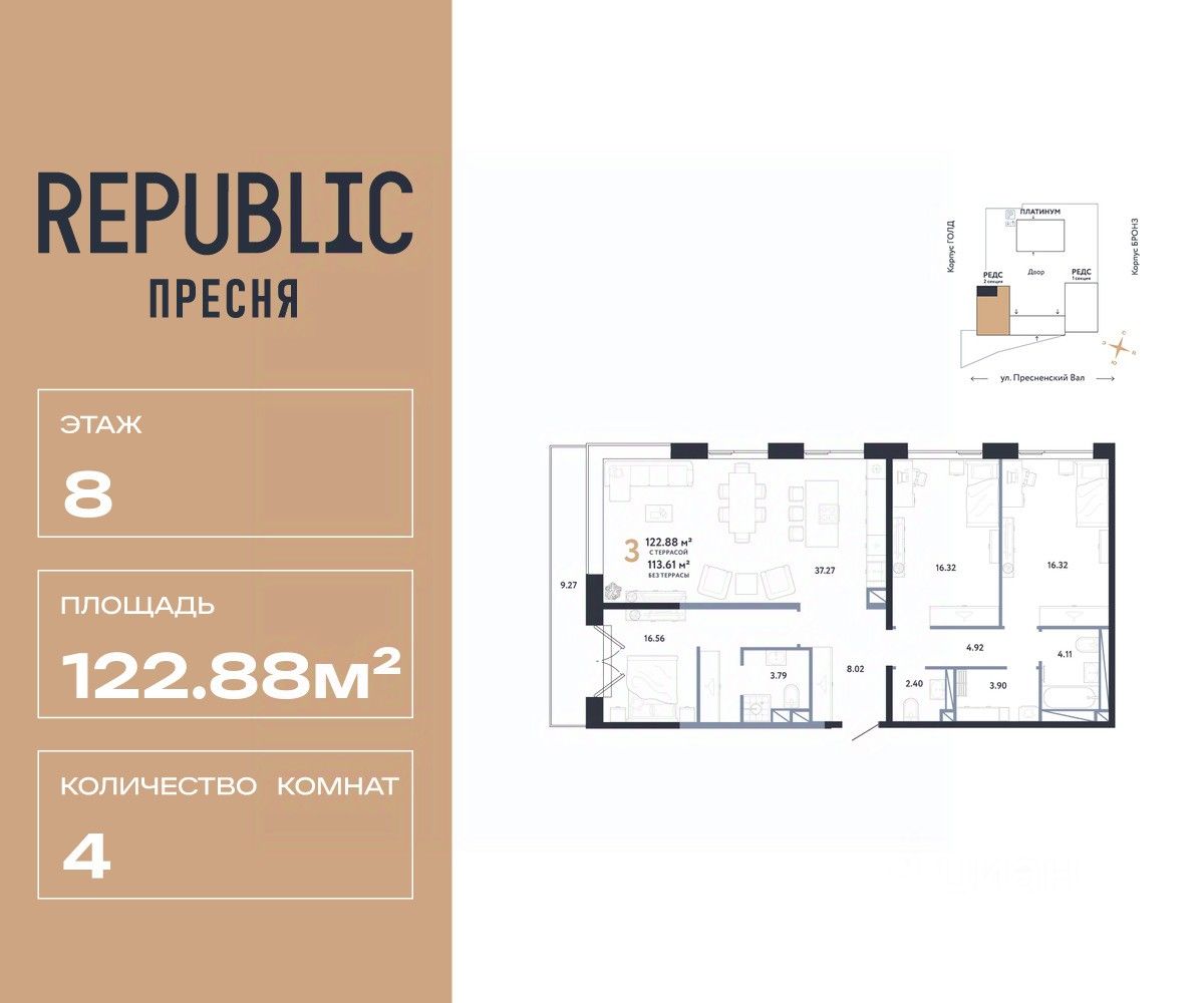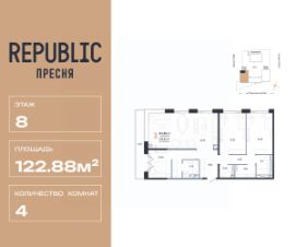 Продается 4комнатная квартира на 8 этаже от застройщика Страна Девелопмент. Площадь квартиры 122,88 кв. м.