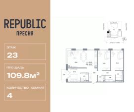 Продается 4комнатная квартира на 23 этаже от застройщика Страна Девелопмент. Площадь квартиры 109,8 кв. м. Стоимость указана без учета акций.