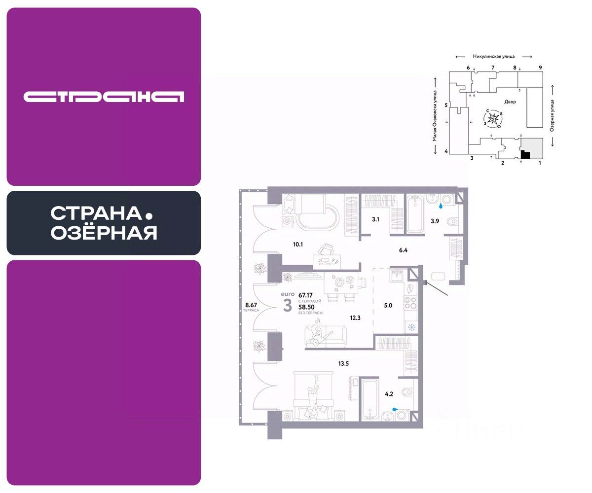 3комнатная квартира площадью 67,17кв. м. на 8этаже в доме "Байкал" жилого комплекса "Страна.Озёрная" . Срок сдачи дома - 2 квартал 2026 года.