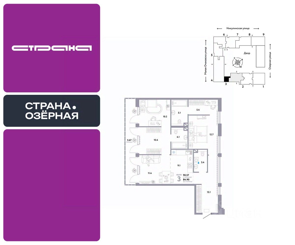3комнатная квартира площадью 90,57кв. м. на 8этаже в доме "Байкал" жилого комплекса "Страна.Озёрная" . Срок сдачи дома - 2 квартал 2026 года.